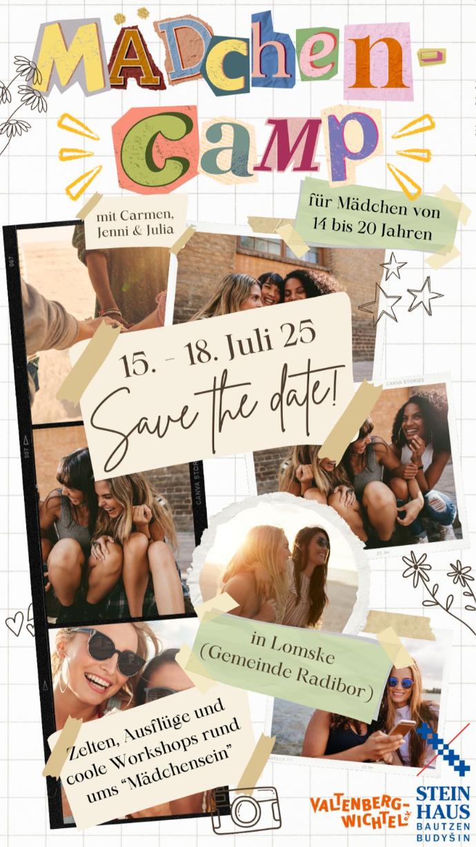 Vom 15. bis 18 . Juli findet unser Mädchencamp in der Gemeinde Radibor statt. Du bist zwischen 14 und 20 Jahre alt und hast Lust auf Zelten, Ausflüge und coole Workshops rund ums Thema Mädchen sein? Dann melde dich bei jennifer.zschornak@steinhaus-bautzen.de oder carmen.edel@steinhaus-bautzen.de an. Freu dich auf 4 Tage Action, nette Leute und gemütliche Abende am Lagerfeuer. Anmeldeschluss ist der 20.06.2025. Sei schnell, denn die Plätze sind begrenzt!